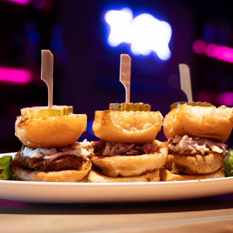 Three Upside-Down Butter Buns Served With Honey-Glazed Pork Shoulder, House Made Coleslaw, A Fried Onion Ring, Topped With A Dill Pickle Chip