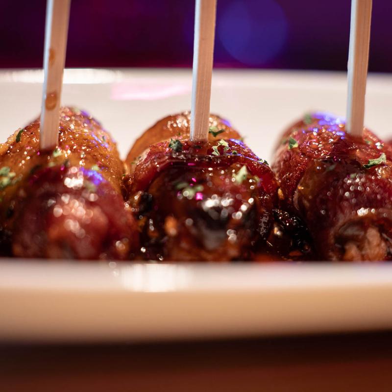 Smoked Bleu Cheese Stuffed Dates, Wrapped In Crispy Bacon, Finished With a Spicy Maple Glaze